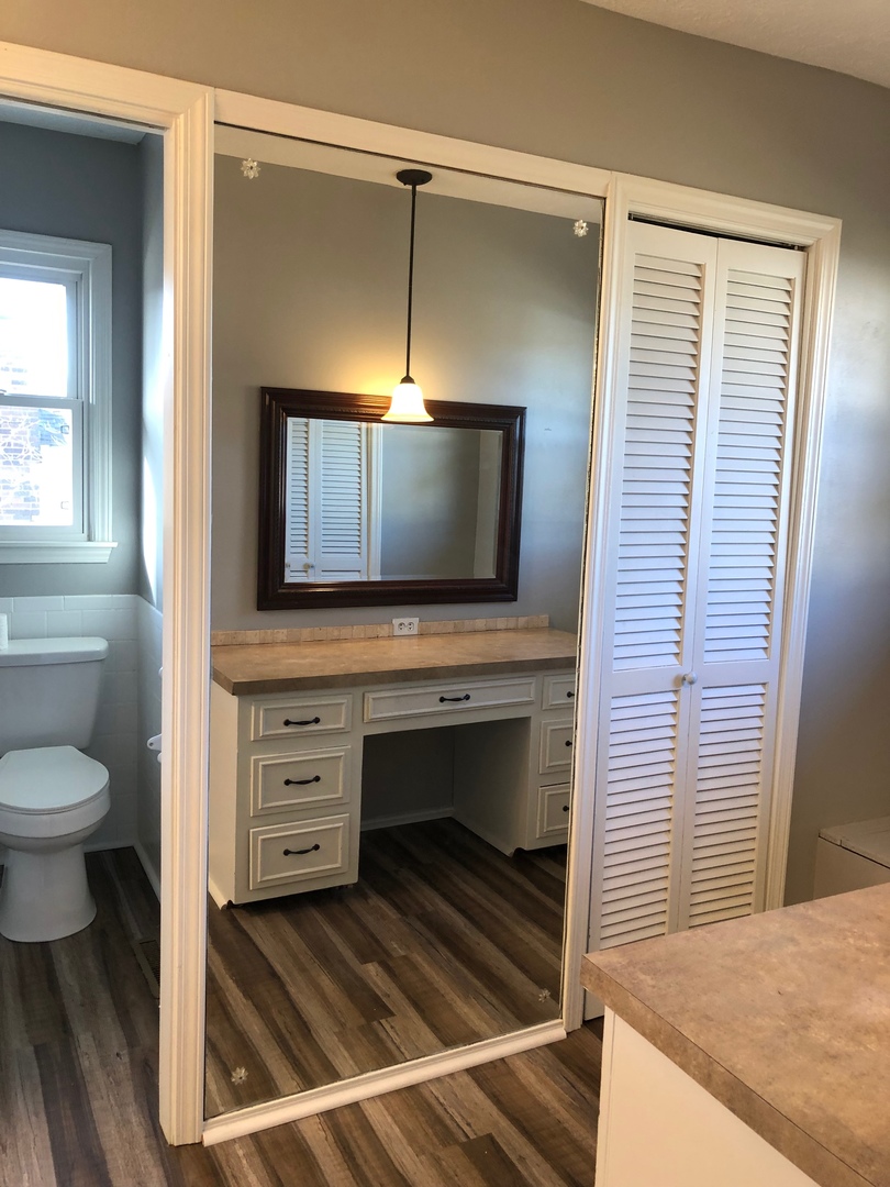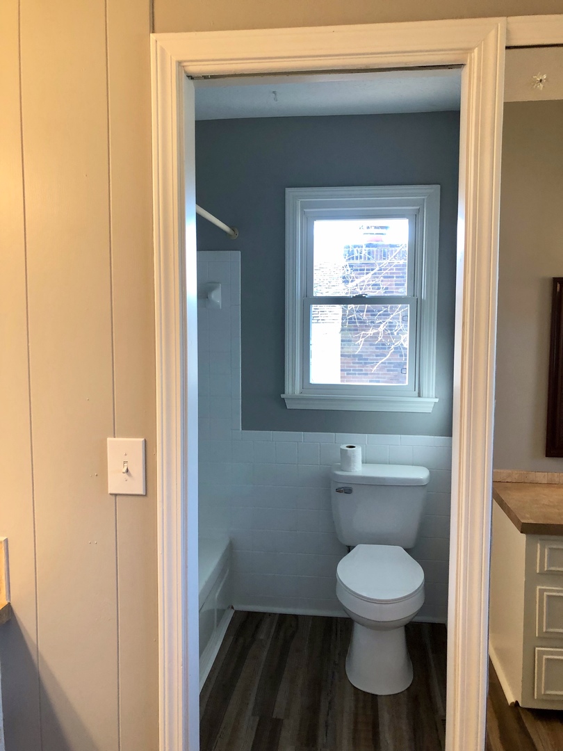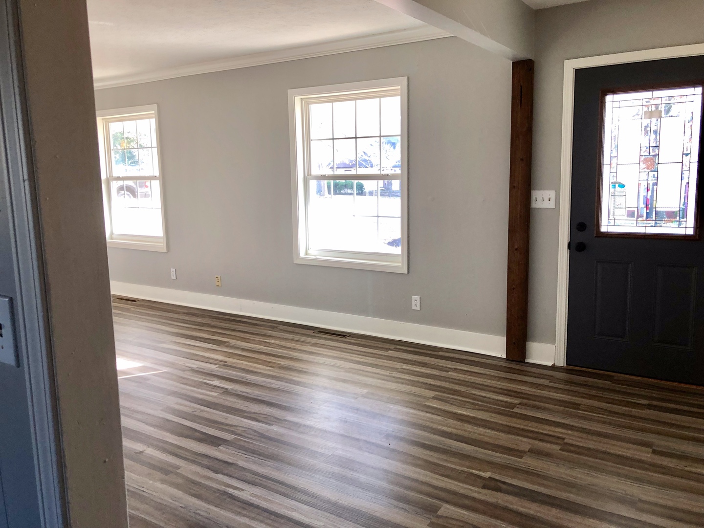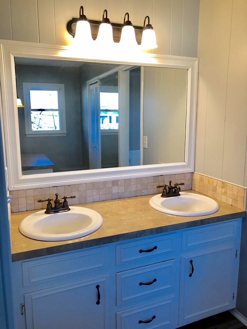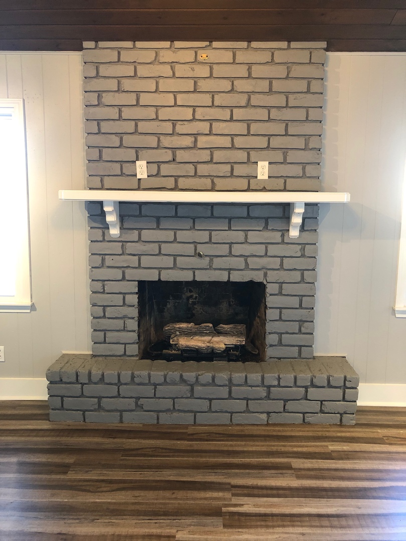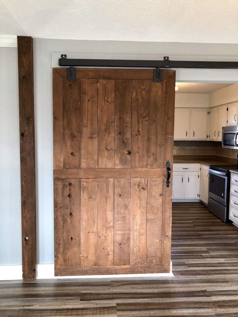 Two living areas, fireplace, sliding barn wood door separating kitchen and main living area as well as fenced in back yard.
